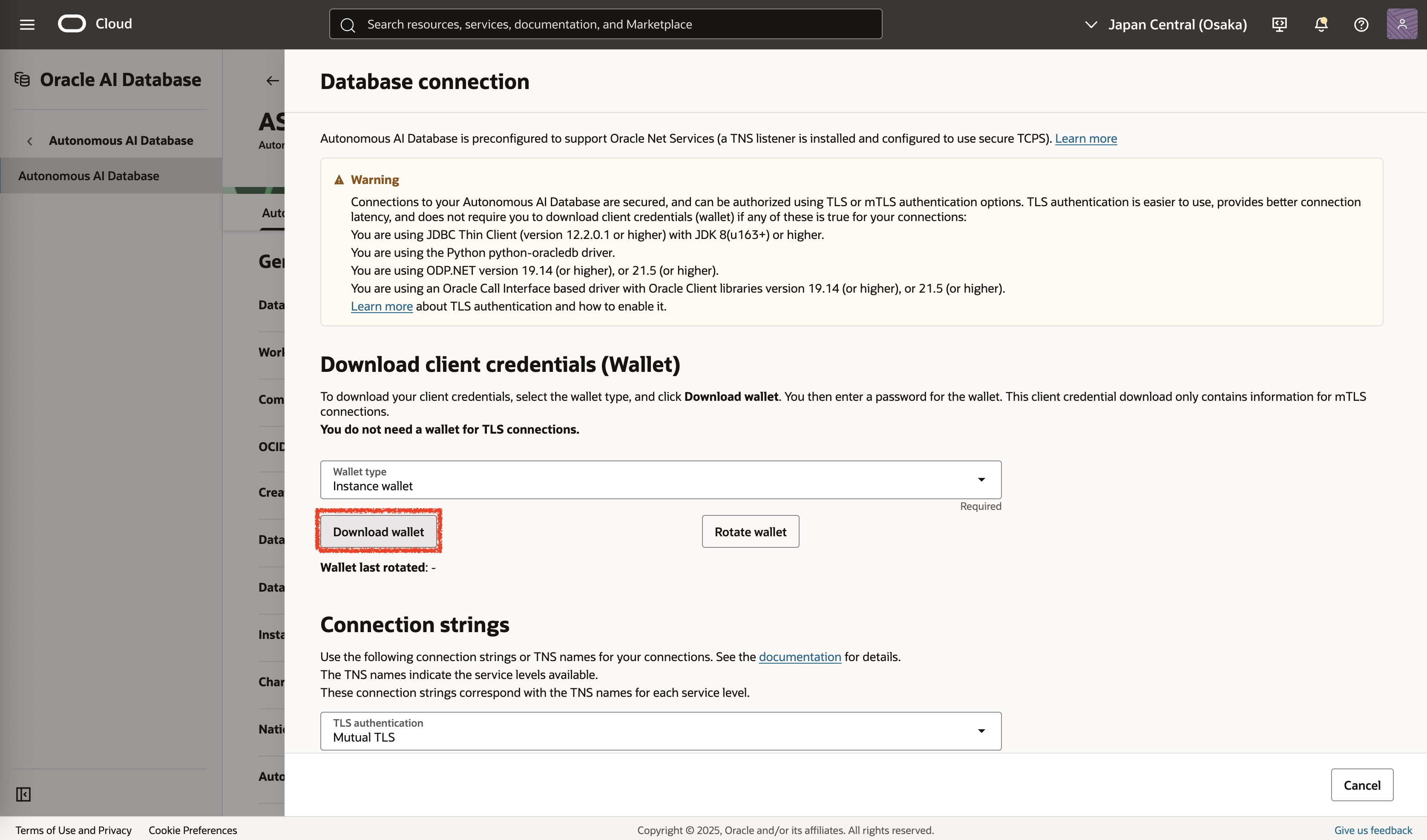 Connection 생성전에 우선 설치한 ADB 상세 화면에서 Wallet을 다운로드 받습니다.