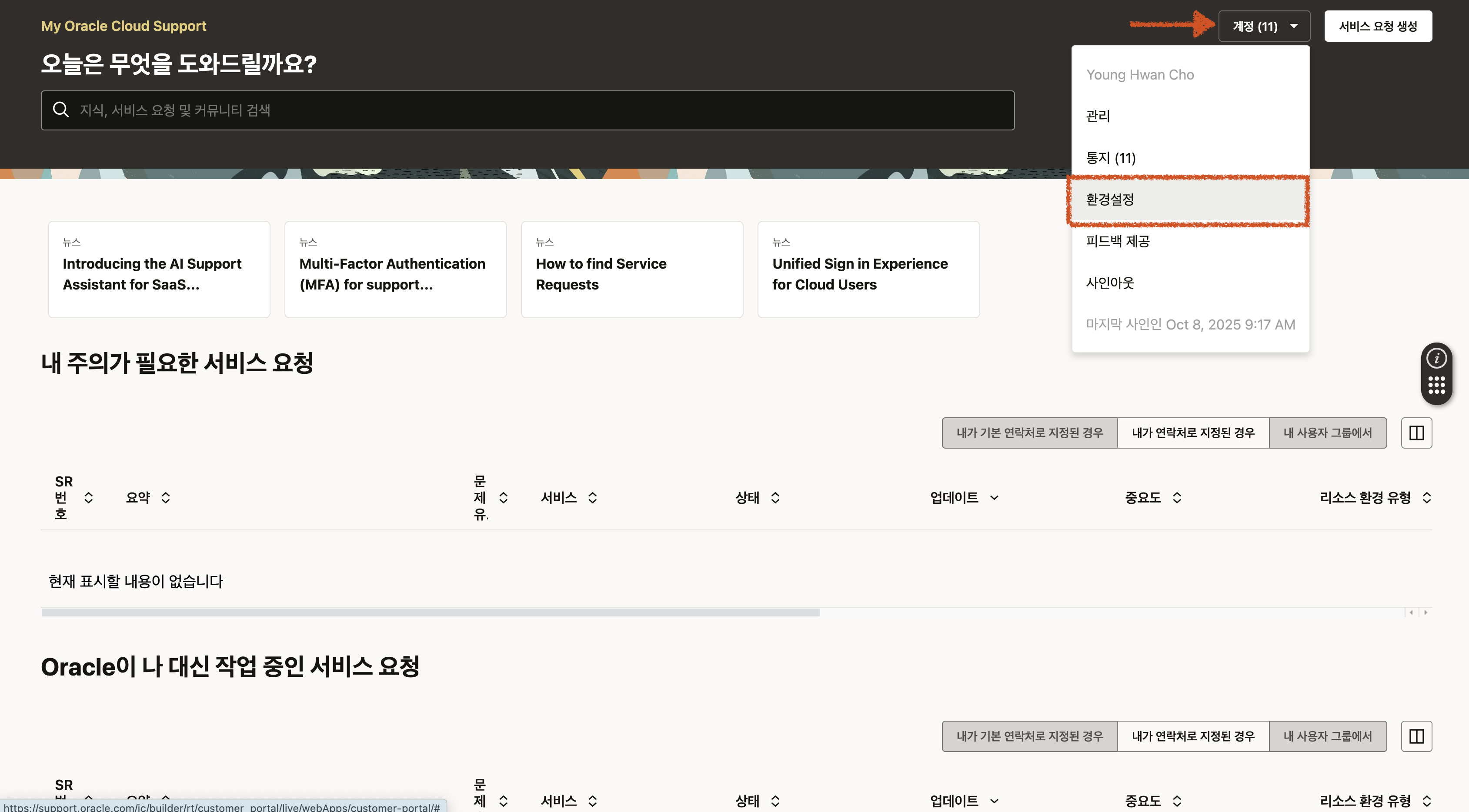 - 신규 사용자를 생성하고 MOS 등록 절차를 이전과 같이 동일하게 진행하면 SR 생성이 가능합니다.