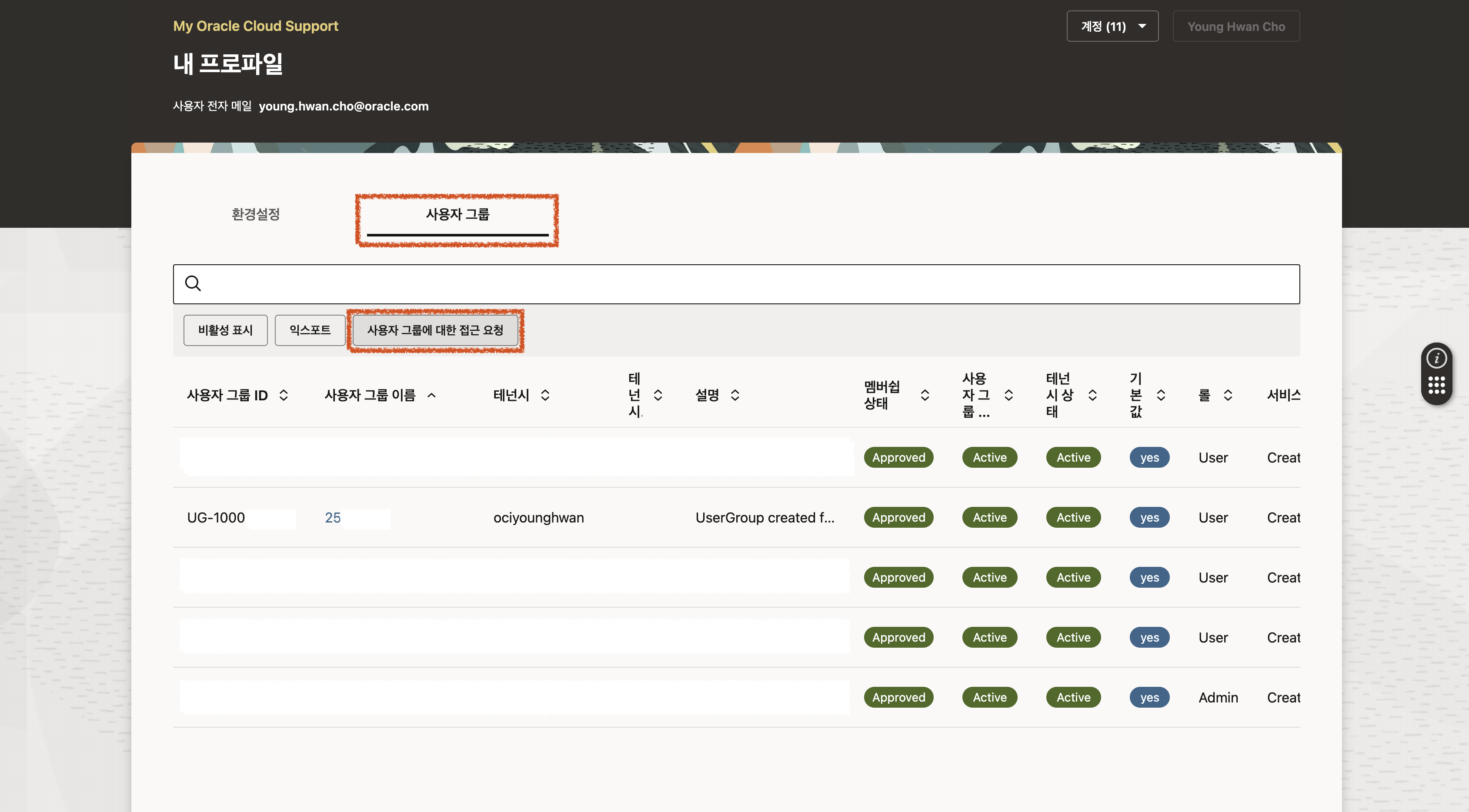 오라클 계정으로 MOS에 로그인한 사용자가 특정 사용자 그룹(테넌시)에 권한을 신청하는 방법입니다.
