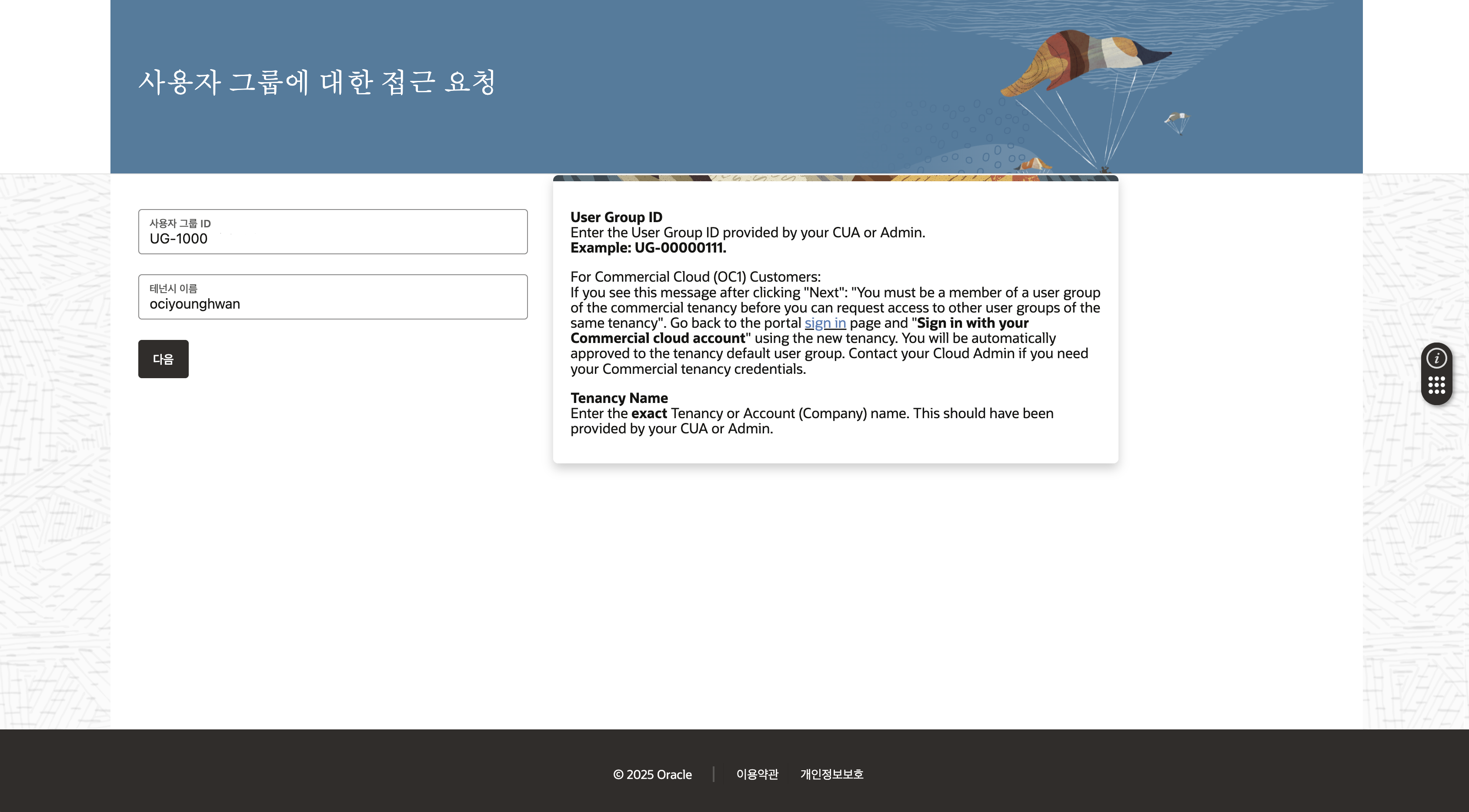 요청하고자 하는 그룹의 사용자 그룹 ID와 테넌시 명을 입력합니다. (해당 정보는 테넌시 관리자를 통해 확인 할 수 있습니다.)