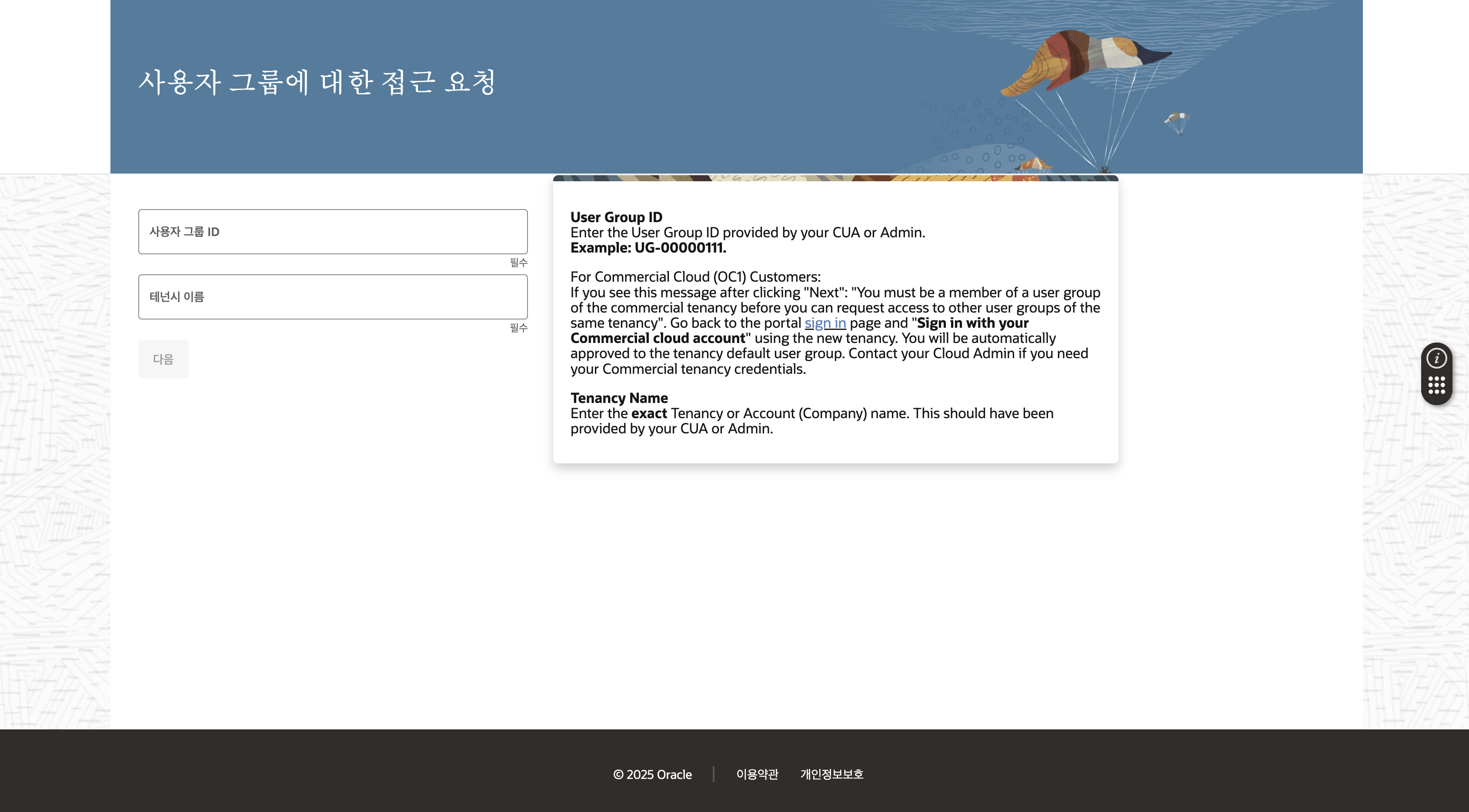 요청하고자 하는 그룹의 사용자 그룹 ID와 테넌시 명을 입력합니다. (해당 정보는 테넌시 관리자를 통해 확인 할 수 있습니다.)