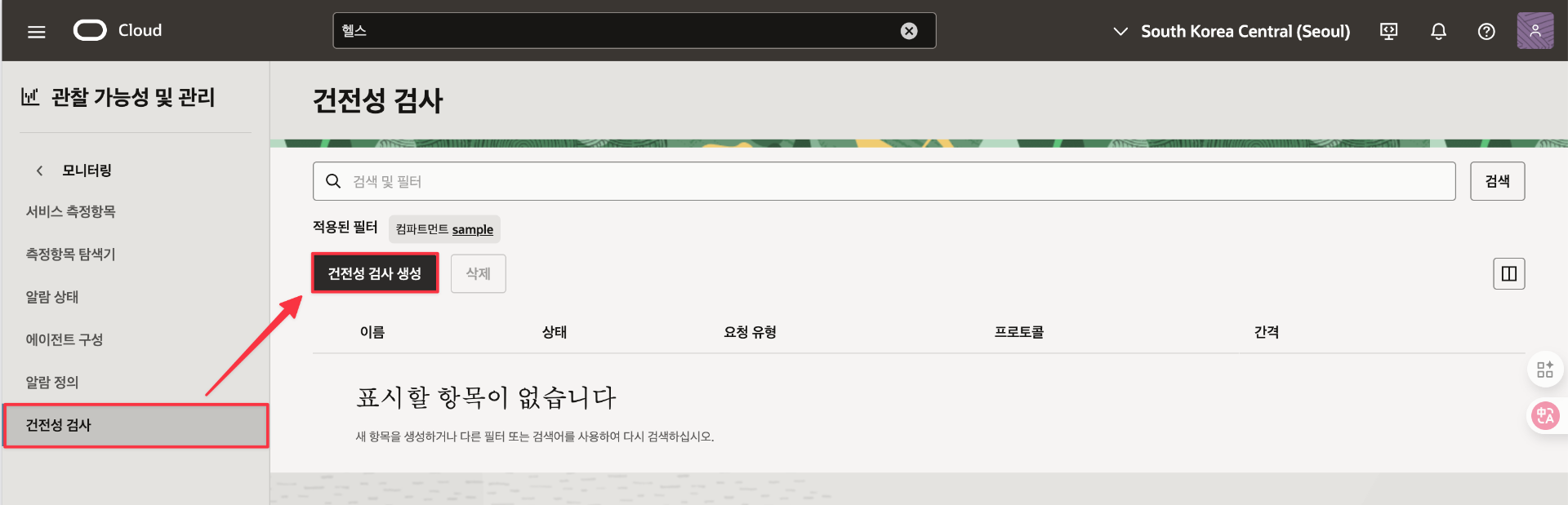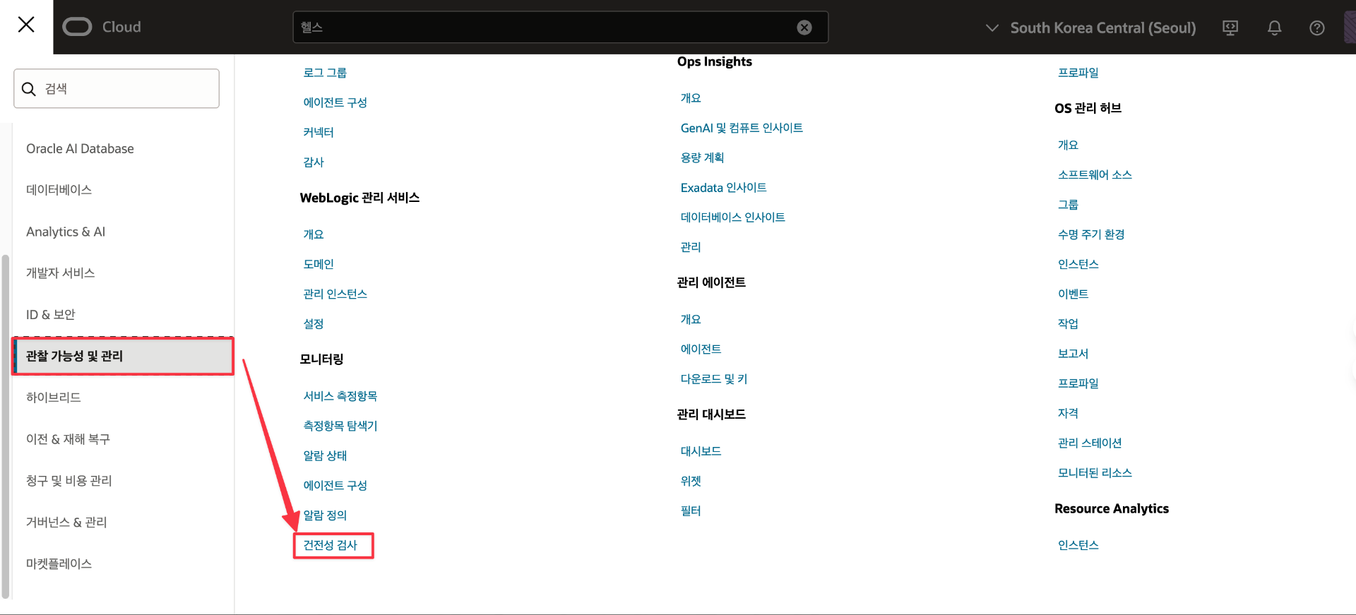 “관찰 가능성 및 관리->모니터링-> 건정성 검사” 클릭하여 이동 합니다.