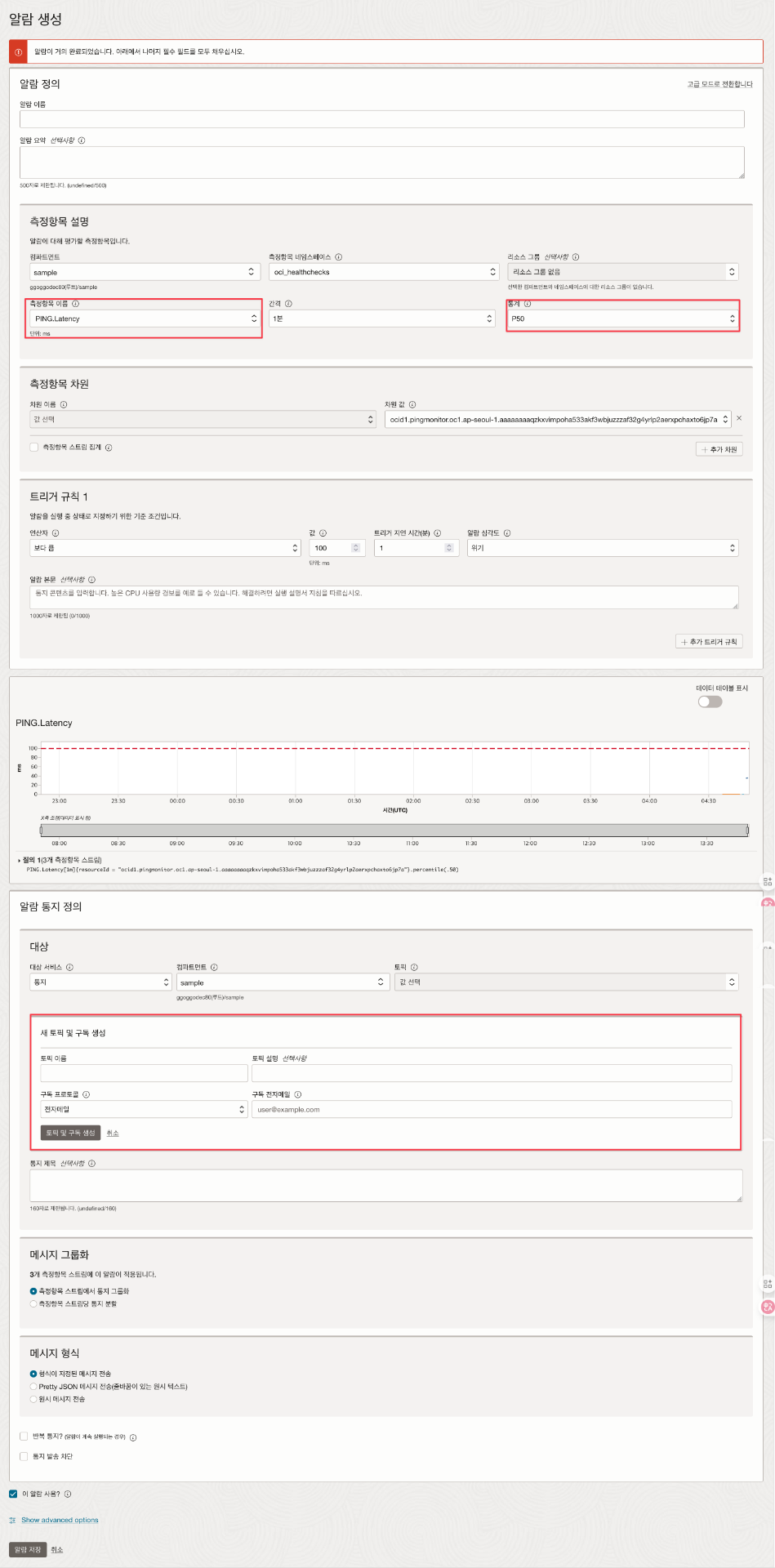 아래의 경우, Ping 결과에 따른 Latency 결과를 모니터링 하기 위해서 “Ping Test Latency Measurement” 메트릭 값을 기준으로 알람을 생성합니다.