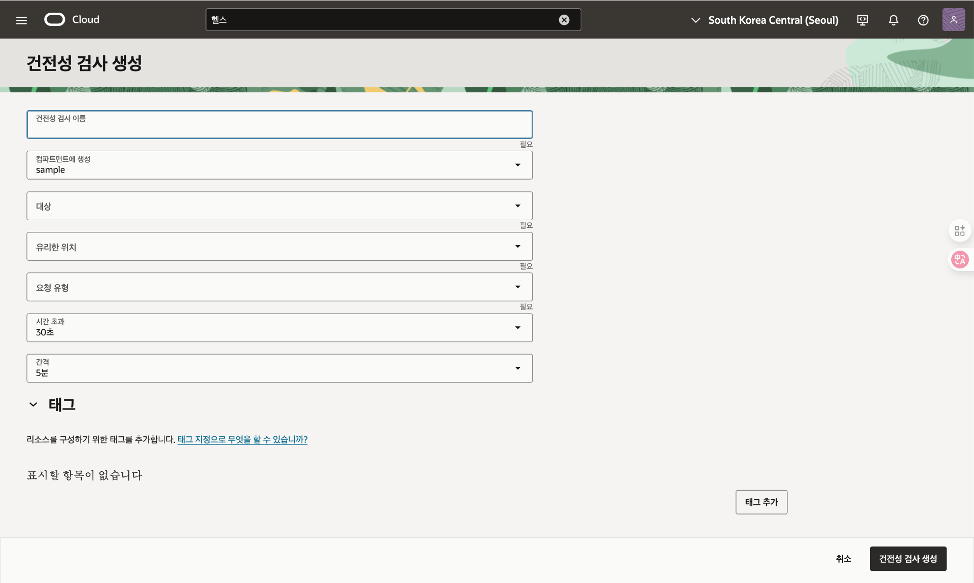 건전성 검사 생성을 클릭하면, 모니터링 할 대상과 설정을 위한 페이지로 이동 합니다.