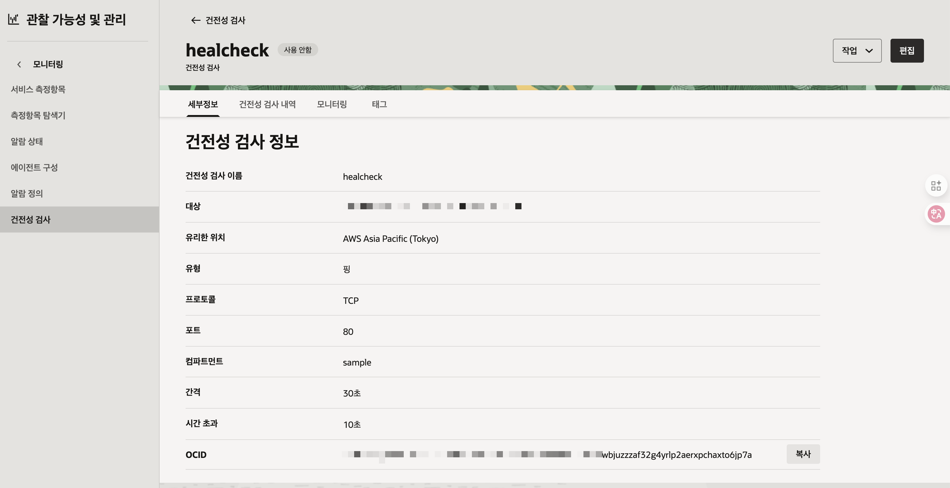 - 대상 : OCI 리소스 중에서 건전성 검사가 필요한 리소스를 선택 할 수 있으며, select box로 현재 모니터링이 가능한 리소스에 대해서 리스트업이 됩니다.