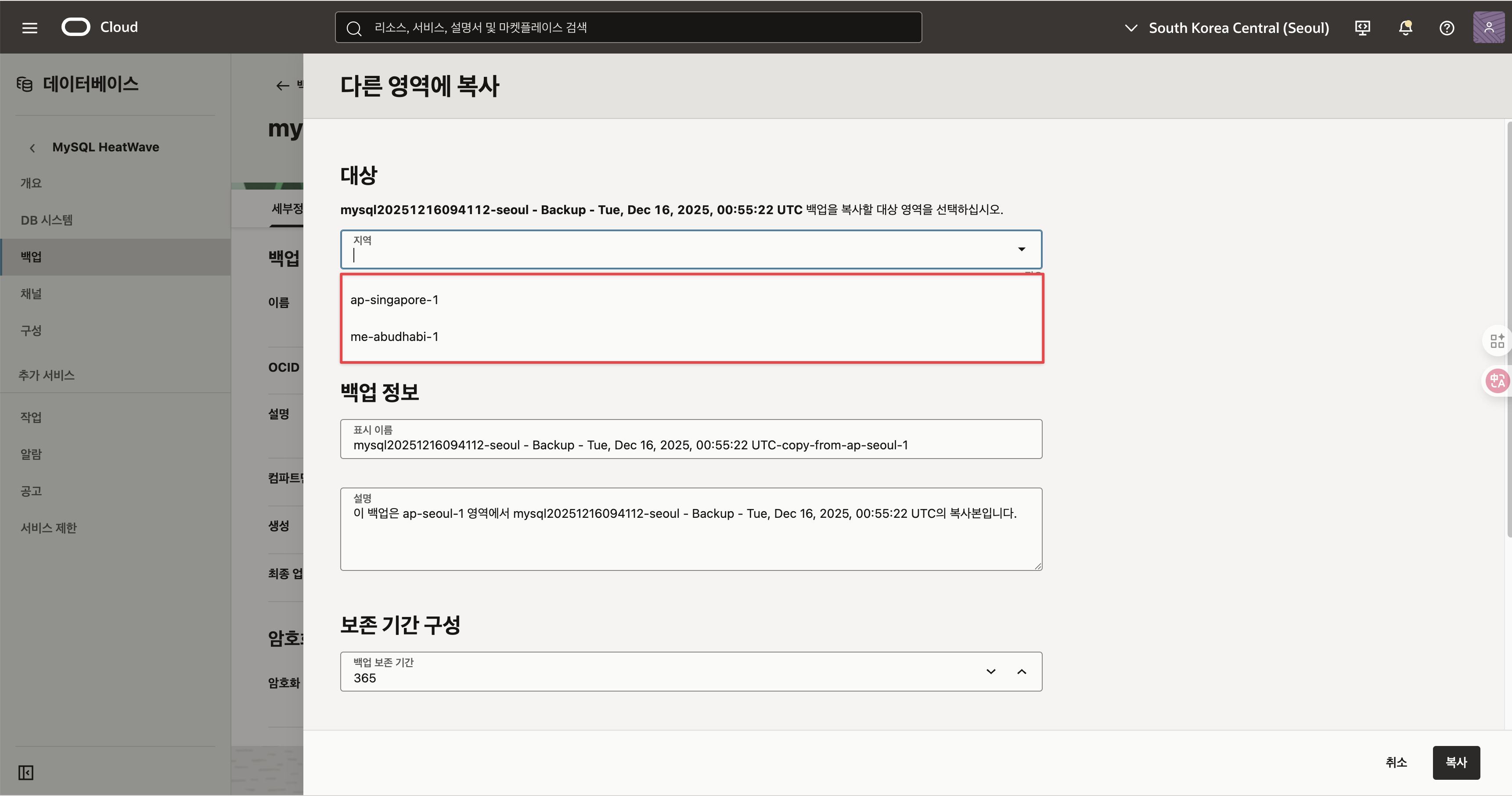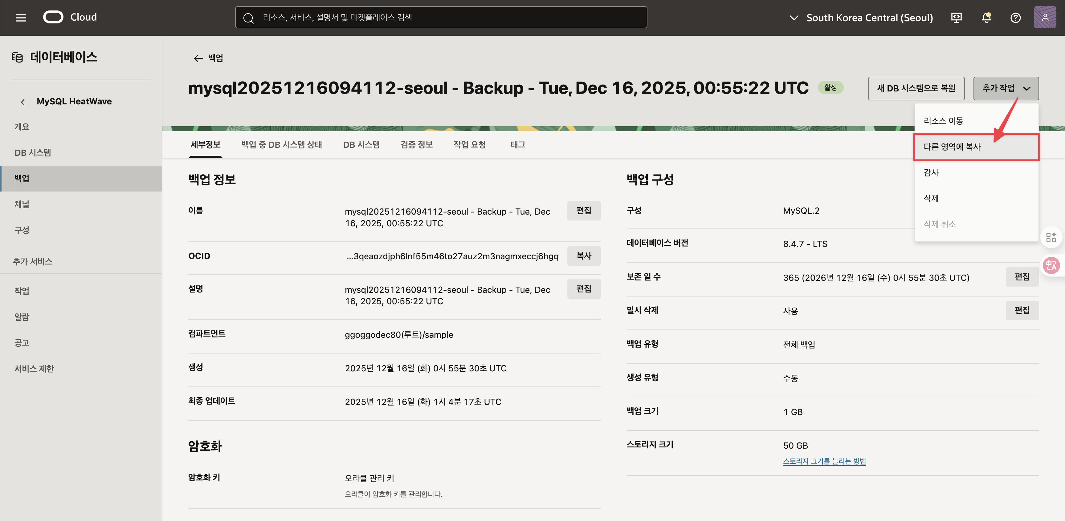서울 Heatwave 전체 백업된 이후 “Copy Backup to Disaster Recovery Region” 을 통해서 싱가포르 리전으로 복제를 합니다.