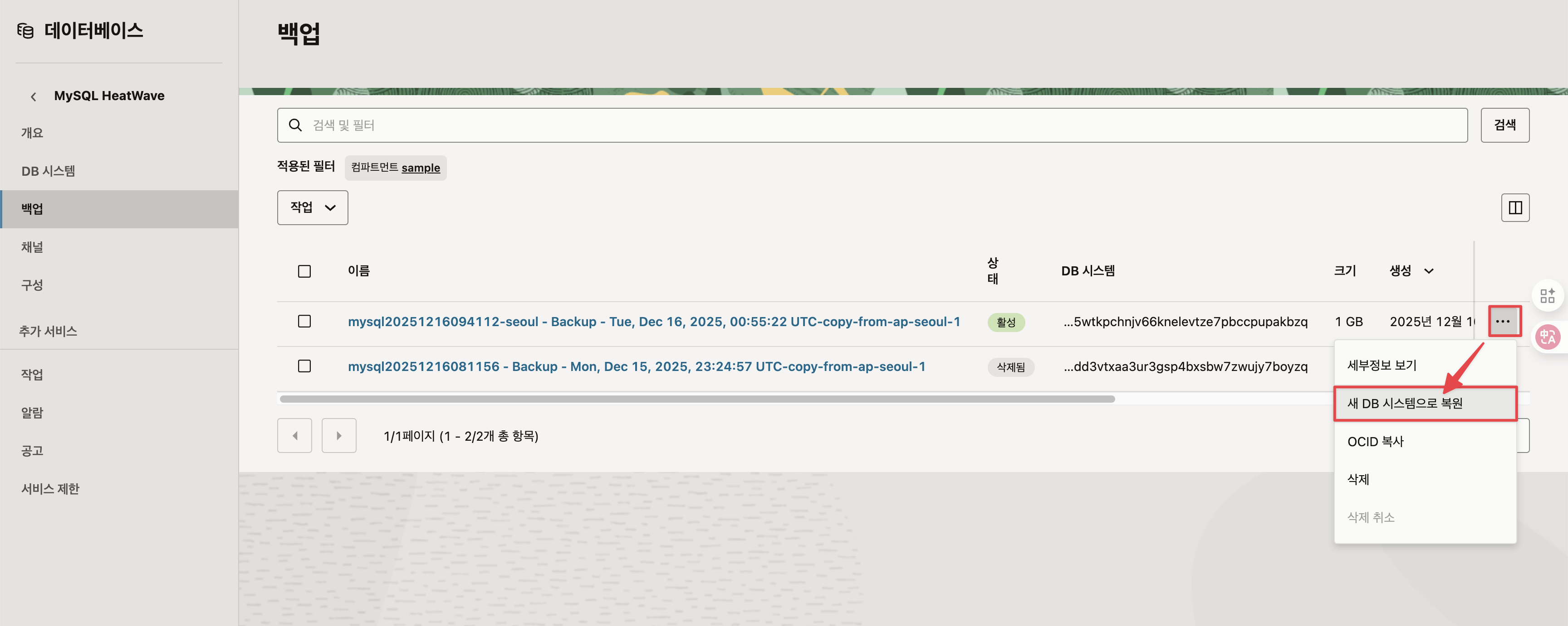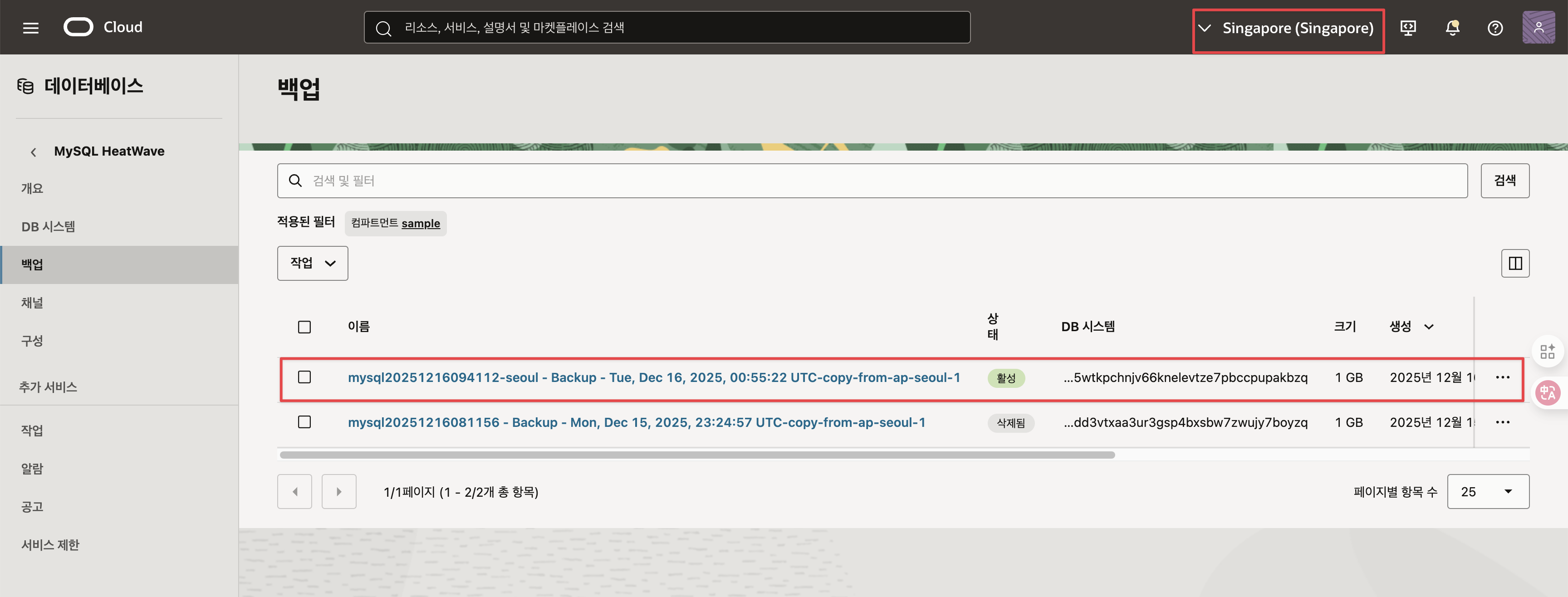 서울에서 복제된 백업이 싱가포르 리전에 보여집니다. 백업된 데이터를 싱가포르에서 새 DB 시스템으로 복원합니다.