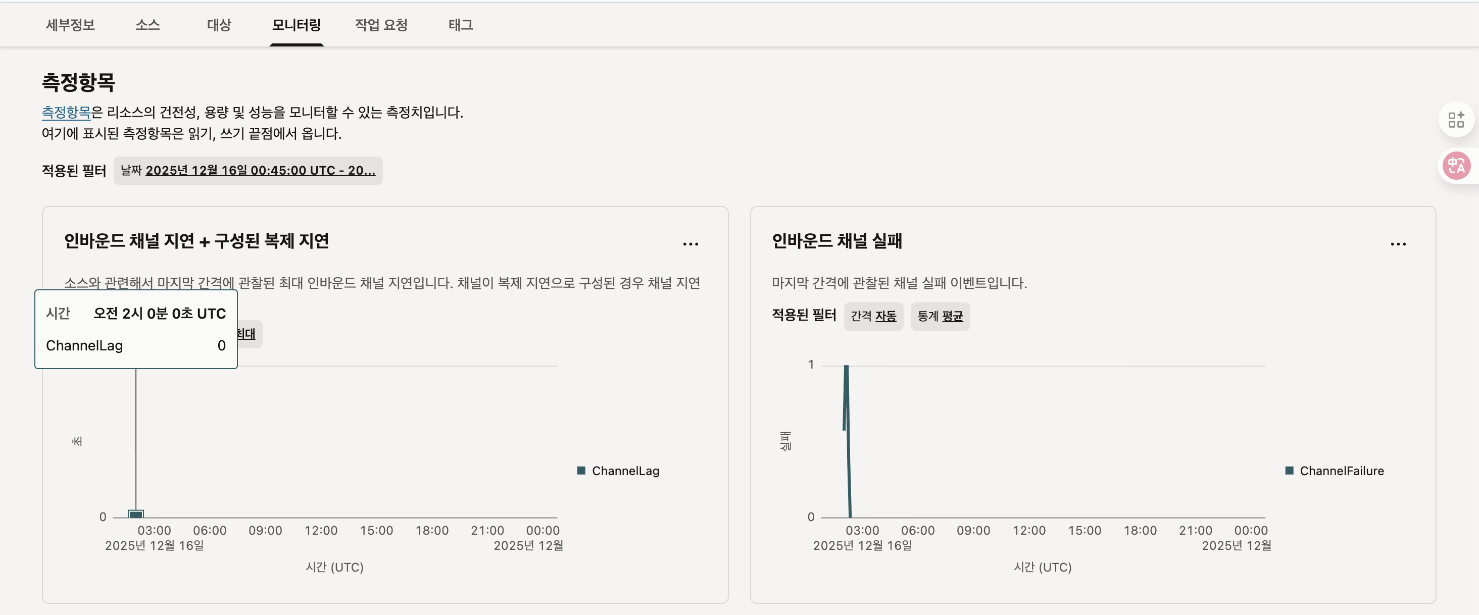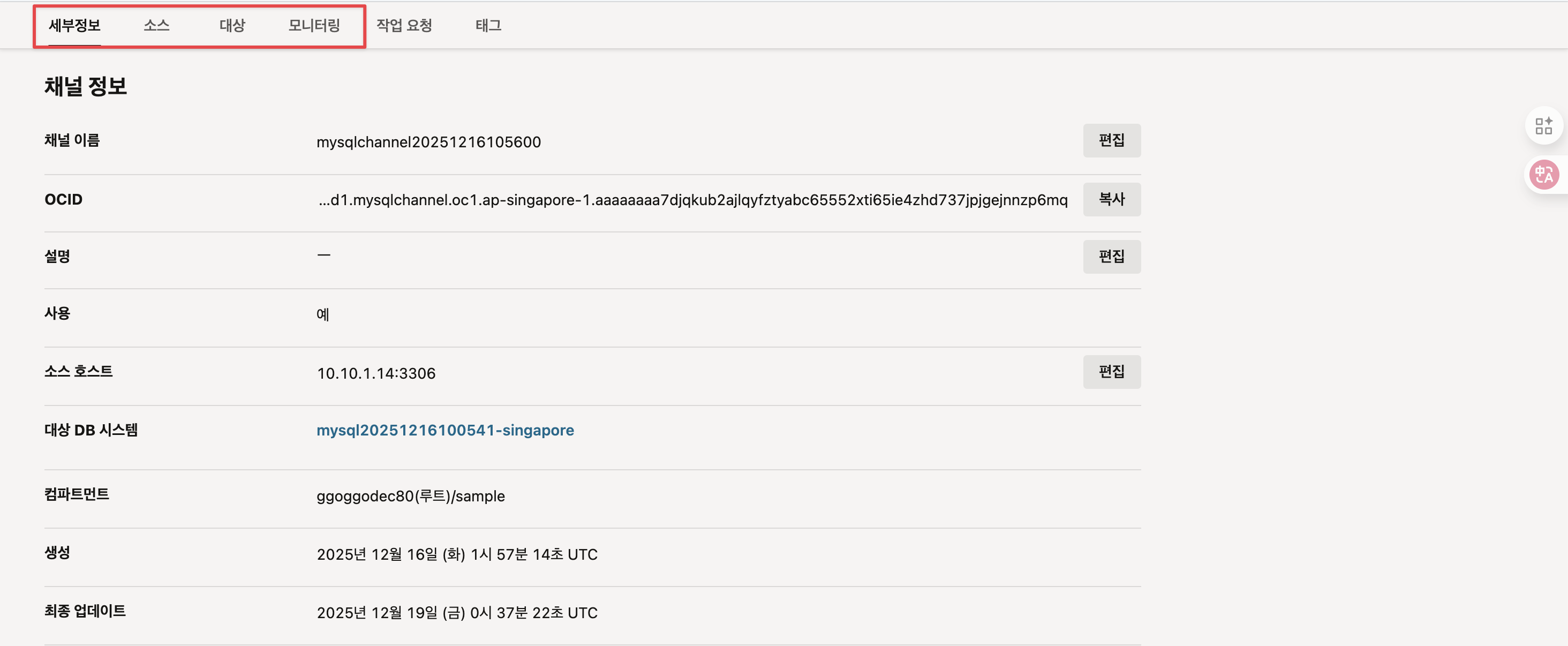 정상적으로 완료되면 아래와 같이 구성된 채널에 대한 상세 정보를 확인 할 수 있습니다. 추후 잘못된 부분이나 수정이 필요한 경우 편집을 통해서 변경 할 수 있습니다. 아래 화면은 구성된 내용이며 각 탭 마다 상세 정보를 확인 할 수 있습니다.