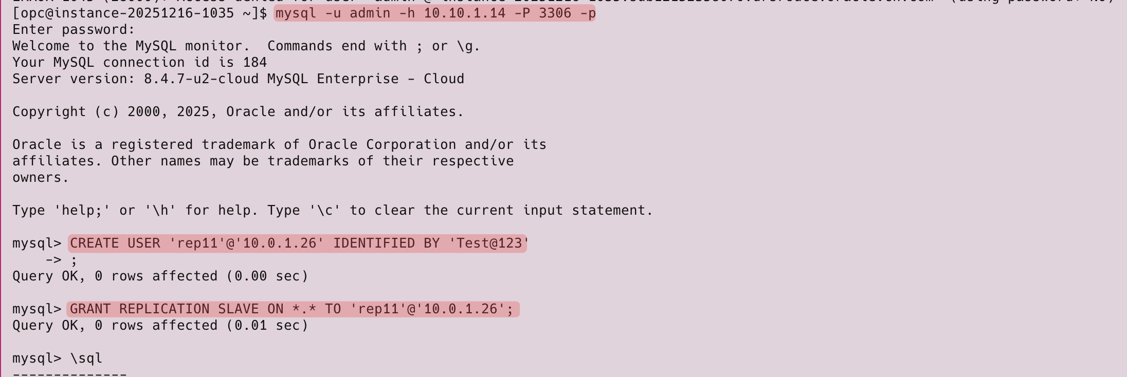 mysql> CREATE USER 'rep11'@'10.0.1.26' IDENTIFIED BY 'Test@123' REQUIRE SSLi Query OK, O rows affected (0.01 sec) mysql› GRANT REPLICATION SLAVE ON *.* TO 'rep11'@'10.0.1.26';