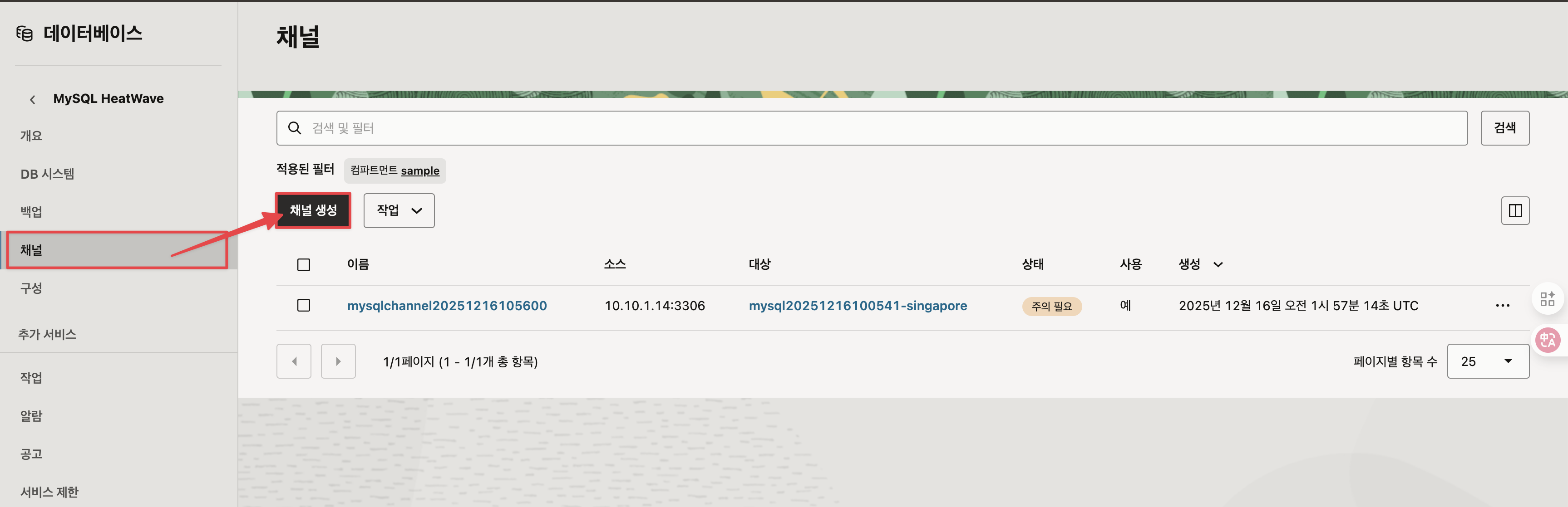 싱가포르에서 신규 데이터 베이스 기반으로 서울과 복제할 채널을 만들어 줍니다.