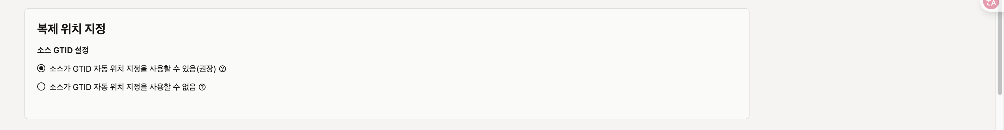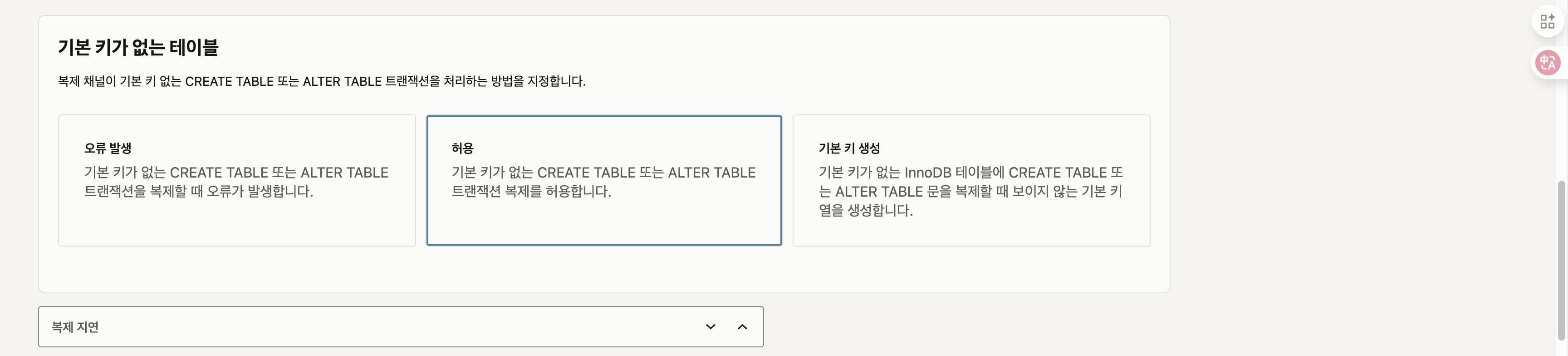 ‘허용’은 기본 키(Primary Key)가 없는 테이블에 대해 CREATE TABLE 또는 ALTER TABLE 트랜잭션이 발생하더라도 복제 채널에서 오류 없이 그대로 복제를 진행하도록 허용하는 설정입니다. 복제지연은 소스에서 수신된 트랜잭션을 적용하기 전에 채널이 기다리는 시간(초)입니다. 최소 1초부터 설정이 가능합니다.