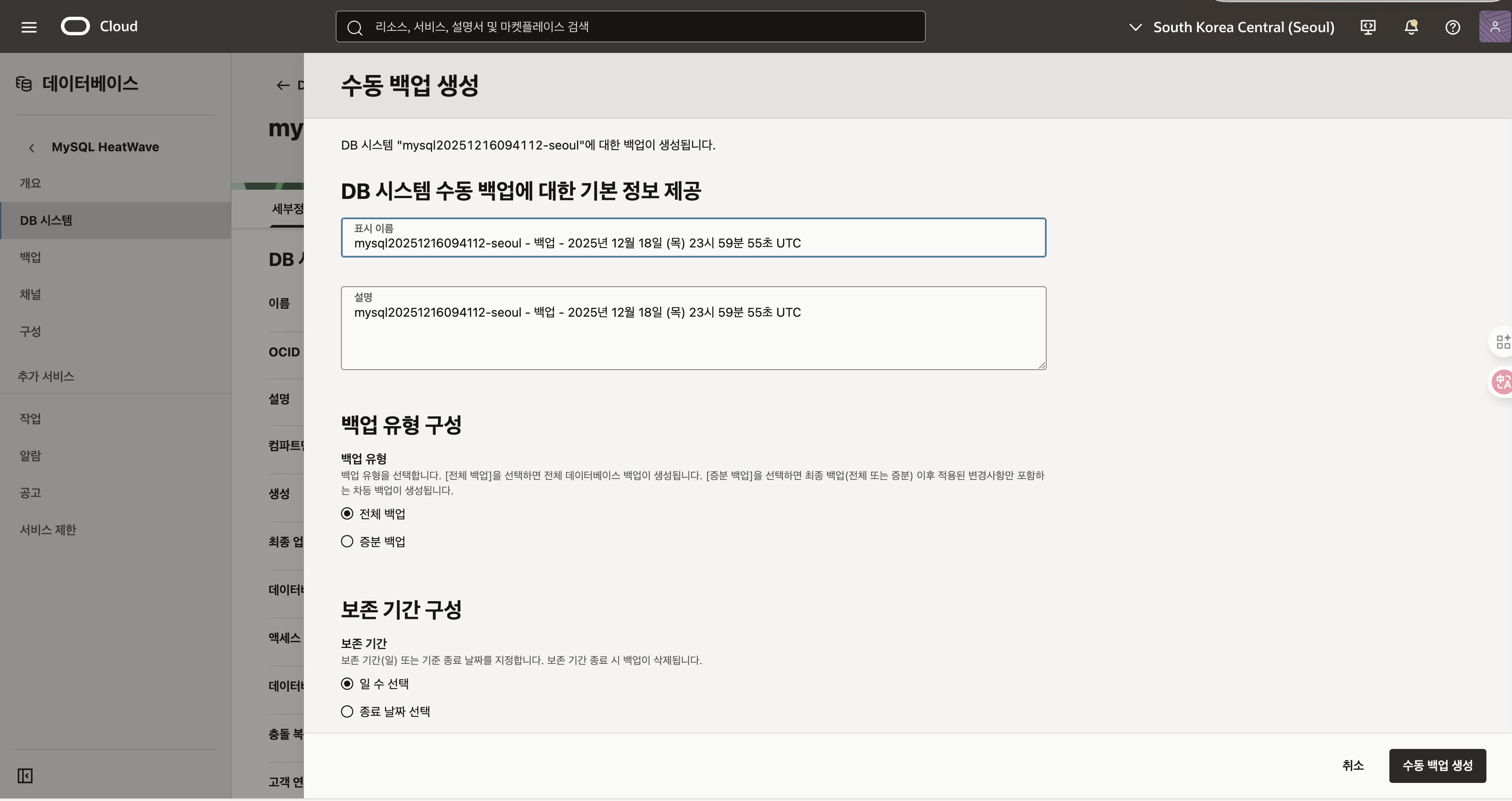 서울 Heatwave 구성이 완료된 전체 백업을 해줍니다.