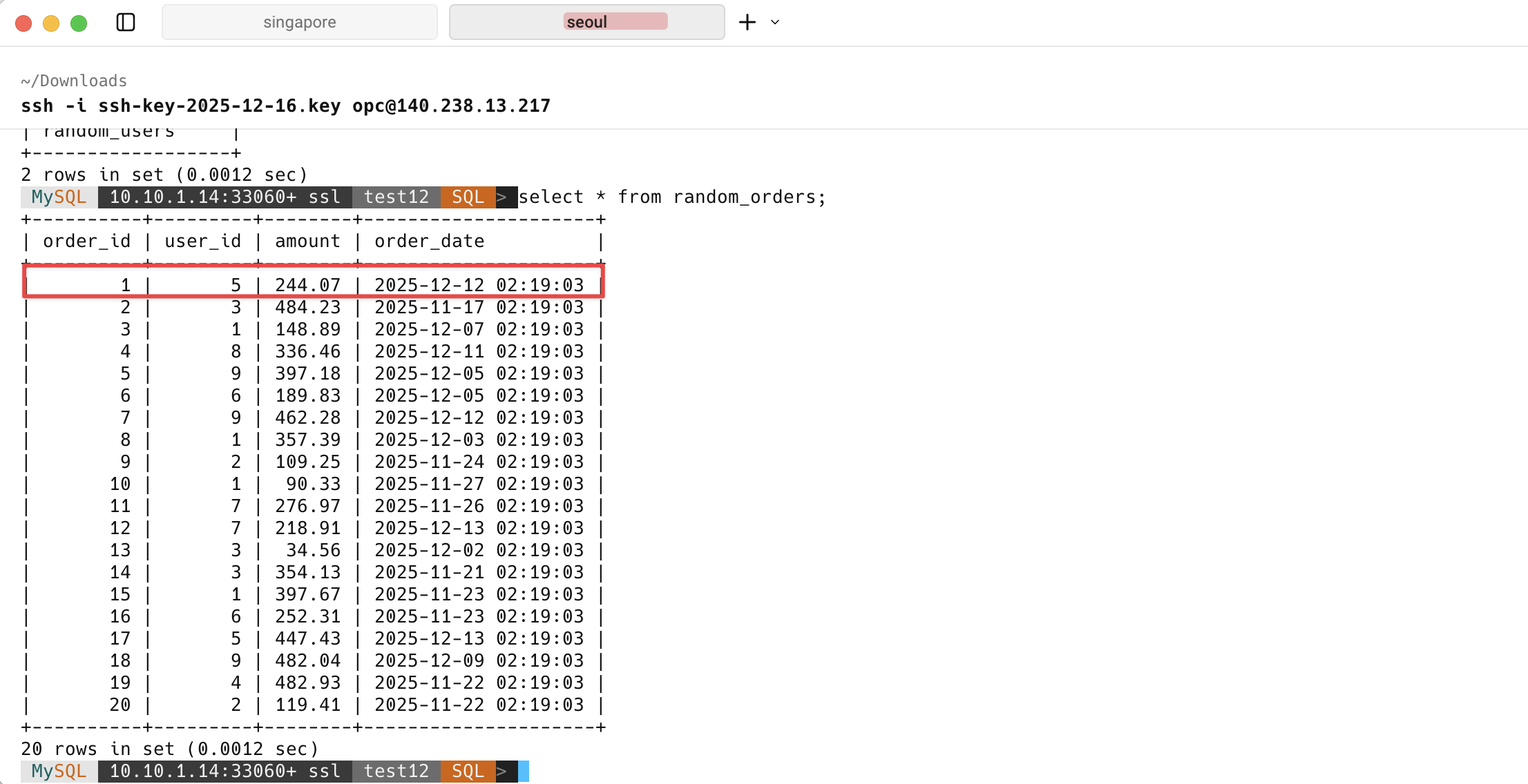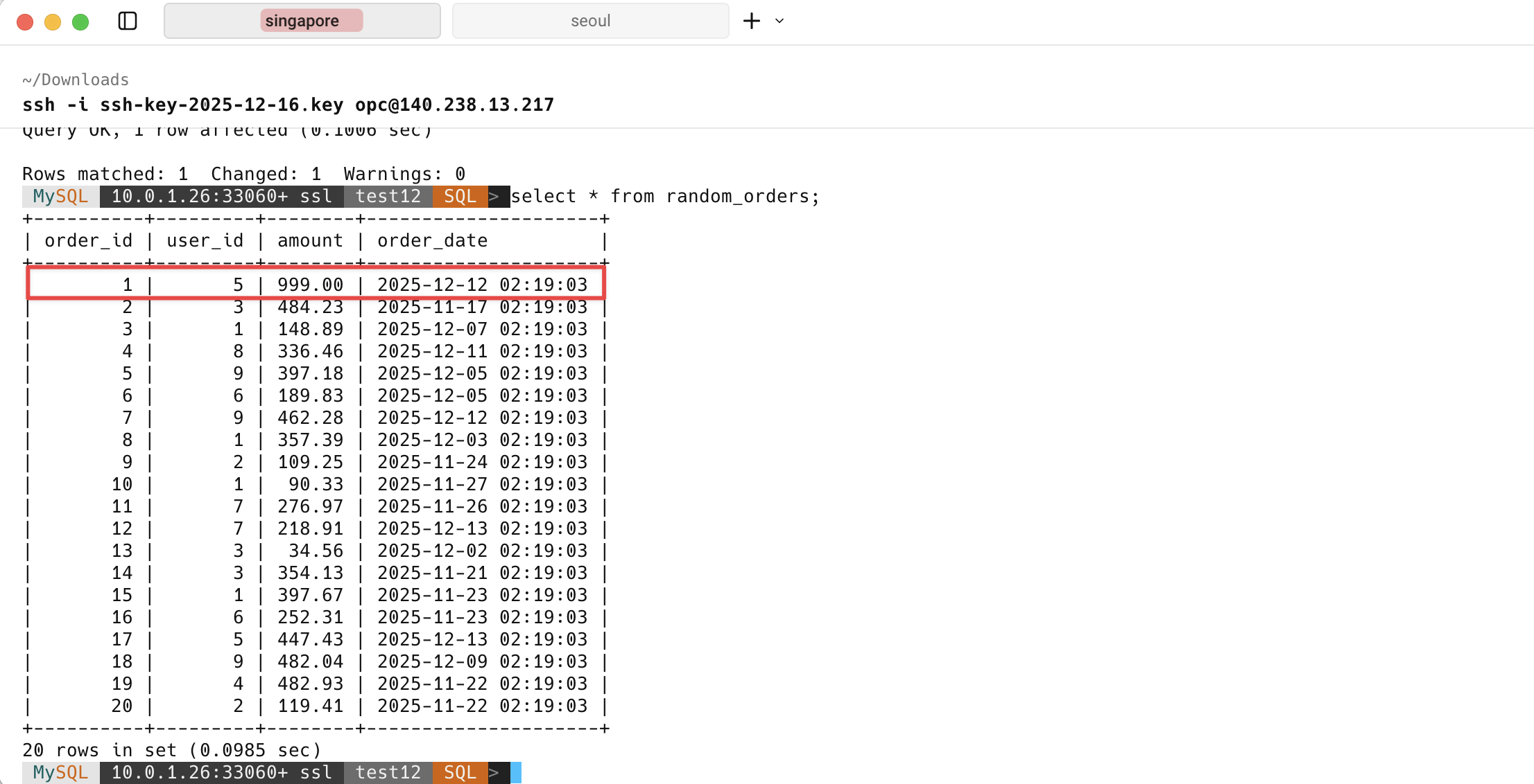 서울과 싱가포르 동일 테이블의 경우, 싱가포르에서 업데이트 하는 경우는 실제 서울에는 적용되지 않습니다. 이는 양방향이 아닌 단방향 동기화이기 때문입니다. 그러나 싱가포르에서 테이블의 생성등은 가능하나, 서울에는 동기화 되지 않습니다.