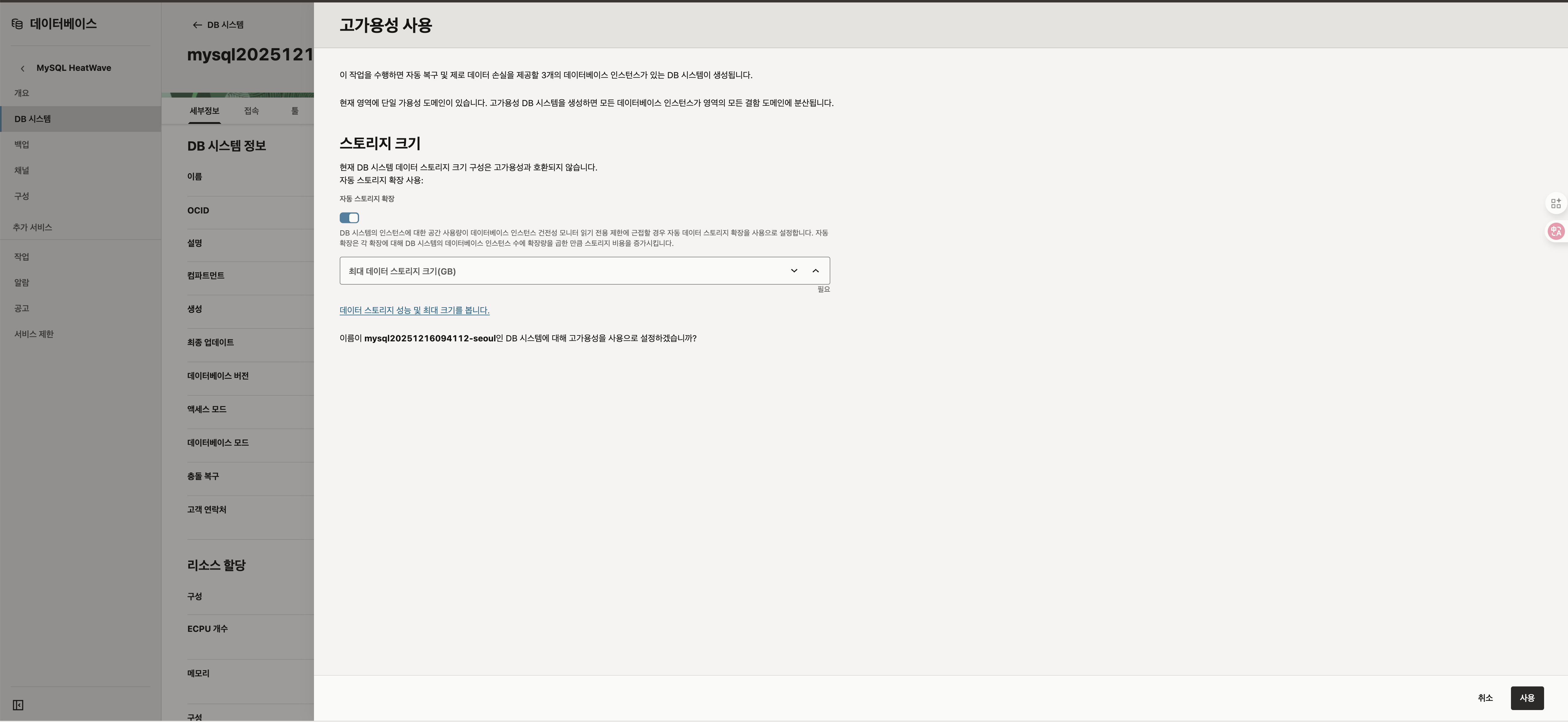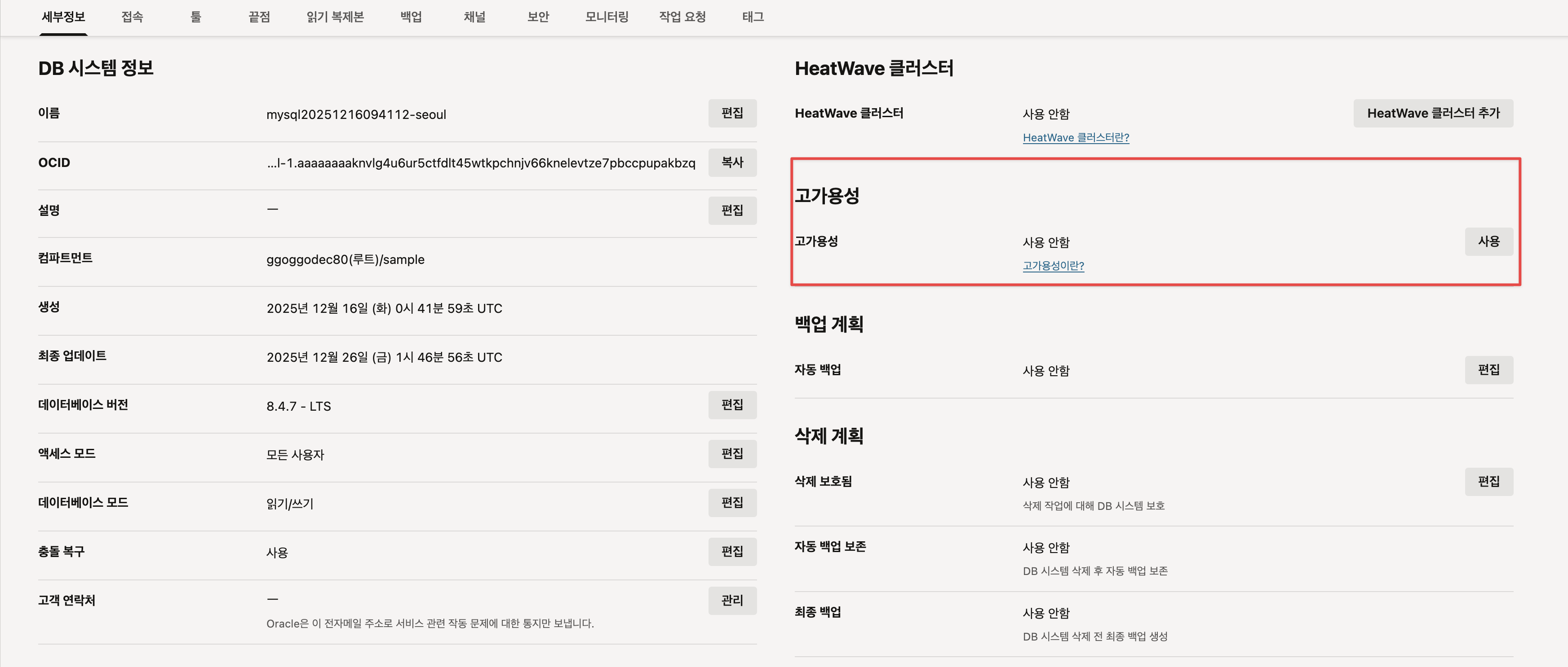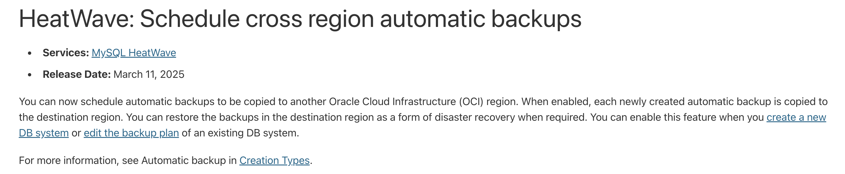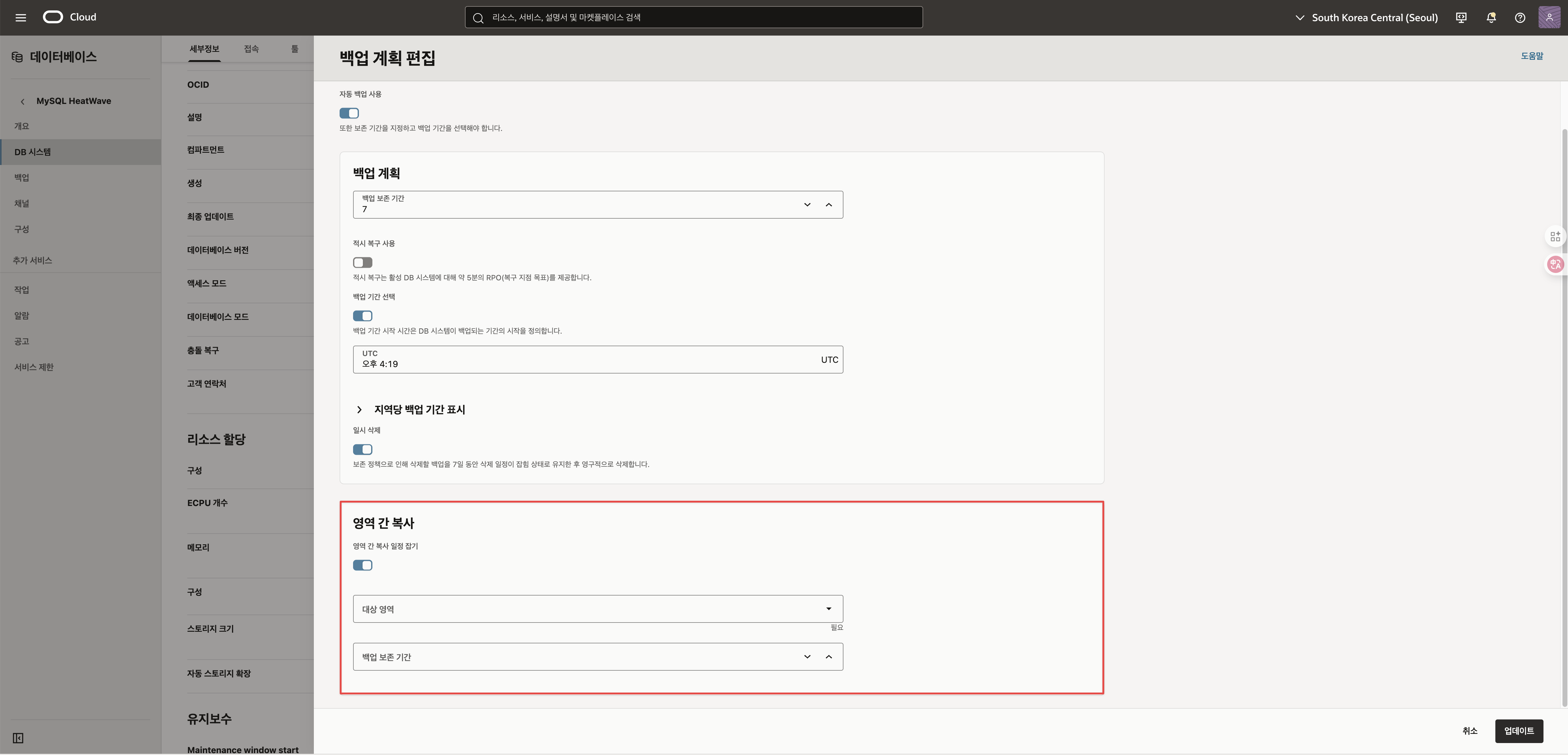 추가적으로 Heatwave 기능으로 백업을 다른 리전으로 복제할 수 있습니다. 이 기능은 Heatwave에 존재하는 리전에 기본 백업이 이뤄지며 이후 사용자가 선택한 리전으로 백업데이터를 복제해 줍니다. 이 경우 DB를 생성하지 않고 백업 데이터만 가지고 있으므로 비용적인면에서 저렴하게 접근할 수 있으나 실제 문제가 생기는 경우 백업데이터를 기준으로 DB를 새로 생성해야하는 부분이 존재합니다. 물론 네트워크 구성도 미리 되어 있어야 어플리케이션에서 접속이 가능합니다.